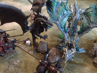 We used our own house rule additions, and trialed a new rule, for 'withdrawing' from combat. This involves a leadership test and a free flee move away if passed, which is automatically rallied. Units can thus attempt to escape bad fights, but frenzied troops can't do this (for obvious reasons). It only happened three times all game: the dragon-mage withdrew from fighting the warpfire dragon and chariot, to save itself, the prince withdrew from fighting the chaos warriors, to flap around and get a charge at the daemon-prince, and the Ellyian reavers rode off from a losing melee at the menhir stone, saving 5 of them (I don't mind fast cavalry escaping from infantry, it's sort of their thing). It worked fine, but the fear is of over-use... i.e, too much running off if losing. We might have to limit it somehow, maybe 1 withdraw move max per turn?